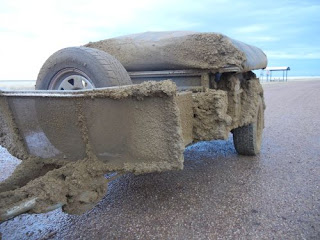 Below are some photos of the trailer as we got back on to the bitumen. While I was able to pull much of the clay and mud off the car and trailer by hand, the problem was that the clay was still lodged inside the wheels on the car. The result - wheel balances and alignments that were so far out that the whole car shook for the next 100 kms into Longreach.